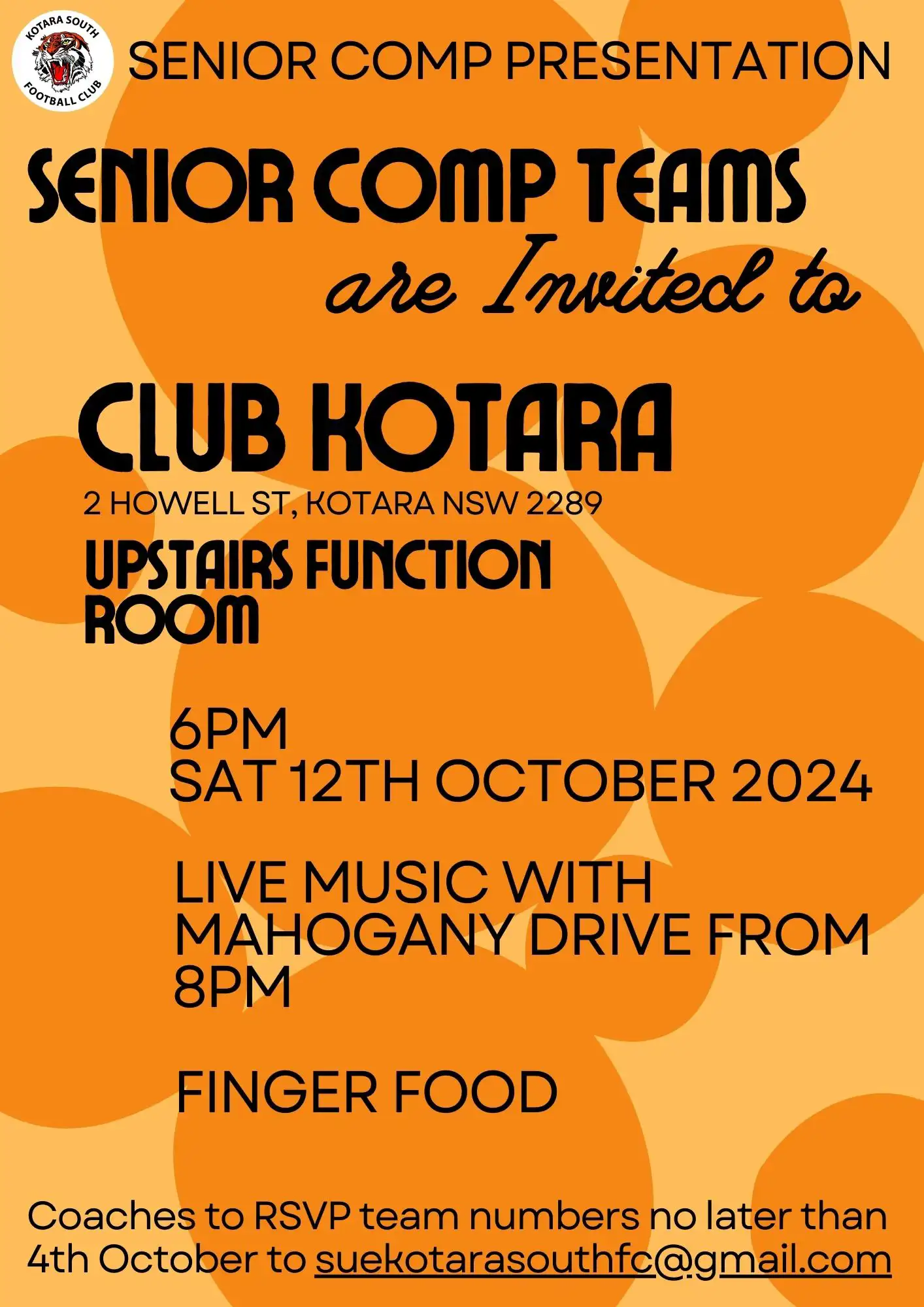 Senior Comp Teams are invited to Club Kotara, Upstairs function room, 2 Howell St, Kotara NSW 2289