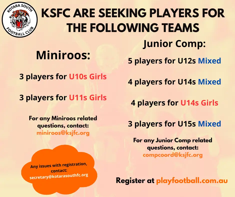 KSFC are on the lookout for new players to join our Miniroos and Junior Comp teams for the upcoming season!